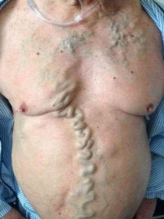 The prominent, rope-like veins over the chest and upper abdomen are dilated superficial veins. Medically, this pattern is most commonly associated with conditions such as: